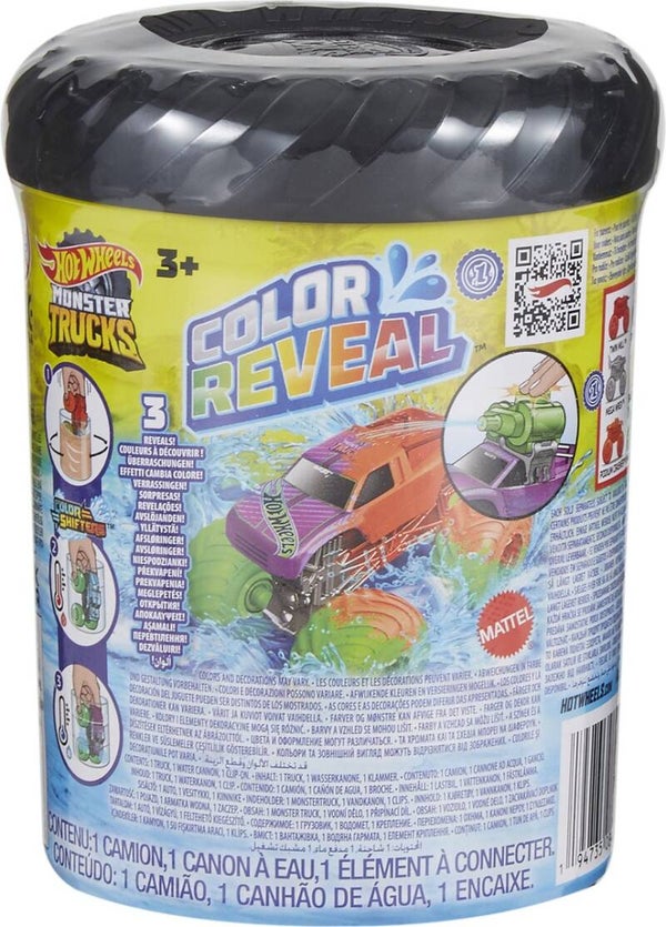 De Hot Wheels Monstertrucks Color Reveal trucks verrassen je elke keer weer! In elke koker vind je 1 Hot Wheels Color Shifters Monstertruck (schaal 1:64) die bedekt is met een speciale Color Reveal coating, en een watertank met clip. Voor de eerste onthulling vul je de koker met water en draai je de truck rond in het water tot het water van kleur verandert. Haal de monstertruck er weer uit: de coole deco's zijn tevoorschijn gekomen! Wil je het uiterlijk opnieuw veranderen? Vul de koker met ijskoud water, laat je monstertruck duiken en kijk hoe de kleuren veranderen: het is magisch! Verander hem weer terug door hem in warm water te dompelen! Met de watertank met clip kun je andere Color Shifters trucks besproeien met water zodat de decoraties veranderen en je een echt watergevecht kunt houden. Kinderen willen graag de hele collectie! Per stuk verkrijgbaar, afhankelijk van beschikbaarheid. Kleuren en versieringen kunnen variëren.
