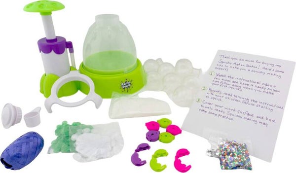 Maak je eigen squishies! Pomp om de grootte van je squishy te bepalen - klein, middel of GIGANTISCH! Vul de squishy! Je kunt je squishy vullen met wat bij de Squishy Maker wordt geleverd of met je eigen slijm en vulling! Squish! Geniet van je eigen squishy!