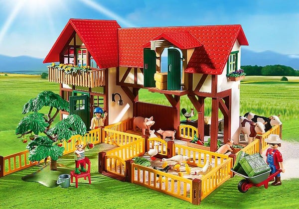Op de grote boerderij van Playmobil is er heel wat te doen. Na het voederen van de varkens en het melken van de koeien met de mobiele melkmachine is het tijd voor een koffiepauze in de gezellige eethoek. Daarna mest de boerin de stallen uit, vult de boer de voorraadzolder aan met de goederenlift en voedert het meisje de kippen en ganzen op het erf. Hier verveel je je nooit.