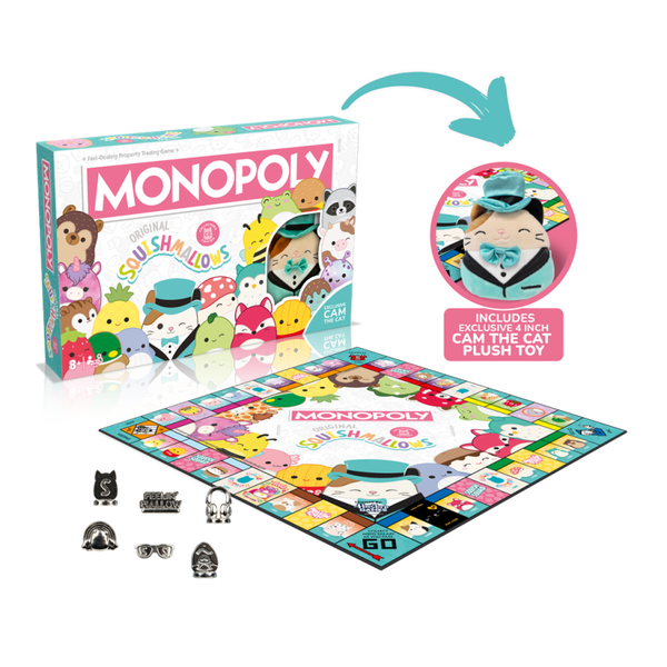 Verzamel je favoriete Squishmallows en beleef het klassieke Monopoly-spel op de zachtste manier met Monopoly Squishmallows. Deze speciale Collector’s Edition laat spelers kopen, verkopen en handelen met personages van de Classic Squad tot de Fantasy Squad, waaronder Fifi the Fox, Rosie the Pig, Leonard the Lion en Benny the Bigfoot. Begin je avontuur met een exclusieve 4” Cam the Cat-pluche en kies uit één van de iconische Squishmallows™-tokens zoals de Headphones, de Rainbow of het Feelin’ Mallow-logo.