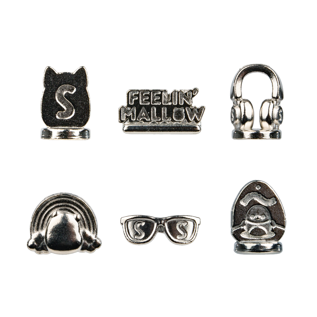 6 metalen tokens geïnspireerd op Squishmallows™, waaronder Sunglasses, Hang Tag en Cam zelf