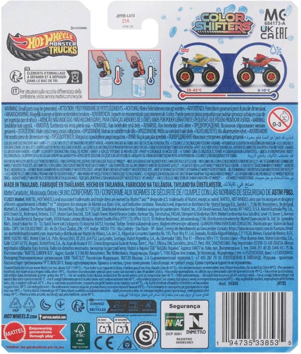 De Hot Wheels Monster Trucks 1:64 Color Shifters Trucks leveren knallen en crashen met de bonus van twee deco's op één truck! Dompel de Color Shifters-truck eenvoudig in ijskoud water om het oorspronkelijke uiterlijk op magische wijze te veranderen, en verander hem vervolgens weer door hem in warm water te dompelen. Herhaal het proces steeds opnieuw om af te wisselen tussen de ontwerpen. Met zoveel geweldige Color Shifters Monster Trucks beschikbaar, zullen kinderen ze allemaal willen verzamelen. Elk afzonderlijk verkrijgbaar, afhankelijk van beschikbaarheid. Kleuren en decoraties kunnen variëren.