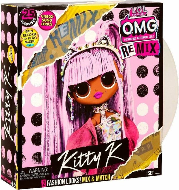 Pak de L.O.L. Surprise! O.M.G. Remix-modepop Pop B.B. met 25 verrassingen. Kitty K is een echte popster-fashionista. Ze heeft een heel mooi gezichtje en prachtig gestyled haar. Ze is klaar voor het ultieme concert tijdens de - So Extra - Tour. Maar ze heeft jouw hulp nodig, want alles is geremixt! Pak de muziekplaat op ware grootte uit en speel hem af op haar platenspelerverpakking. De plaat speelt echt Kitty K's popcouplet af van de verrassingssong. Bereid haar daarna voor op de show. Kitty K heeft 2 complete fashionlooks bij zich... maar de tweede outfit is geremixt! Verzamel haar BFFs om haar look af te maken. Precies op tijd voor het optreden! Ze is ook inclusief muziekaccessoires, zodat ze helemaal klaar is voor het concert. Zet haar in een fotogenieke pose op de inbegrepen poppenstandaard om met haar te pronken. Ook inbegrepen is haar tijdschrift met de tekst voor haar deel van de song. Verzamel alle songtekstbladen van de hele L.O.L. Surprise! Remix-lijn om de song compleet te krijgen. Of mix en match songteksten om je eigen remix te creëren.