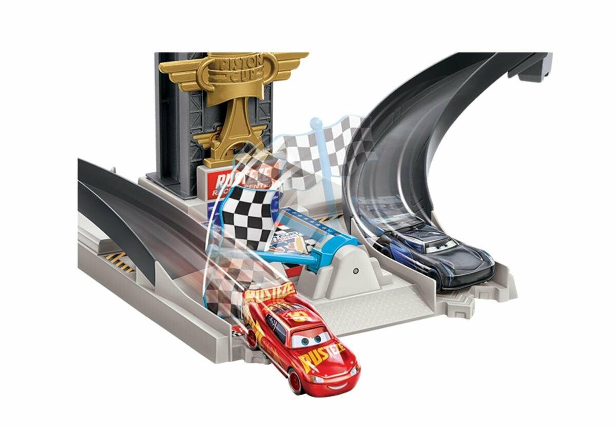 Fans van Disney en Pixar Cars beleven spanning en sensatie met de Rust-Eze Racetoren! Net als het beroemde trainingscentrum uit de film heeft deze speelset verschillende zones waar de voertuigen zich kunnen voorbereiden en een extra racebaan. Oefen het racen in de simulator, neem de lift naar de start met twee auto's tegelijk en rijd oefenrondes met de inbegrepen kunststof Lightning McQueen op een schaal van 1:55! Pak een andere Cars auto erbij en strijd in een sensationele nek-aan-nekrace! De startpoort laat de voertuigen tegelijk de baan op glijden, wel zo eerlijk! Een bewegende vlag laat zien wie de winnaar is. Je overwinning vier je natuurlijk in de winnaarscirkel! Voor nog meer Cars actie en speelplezier kun je deze Toren Speelset verbinden met de Garage Speelset.
