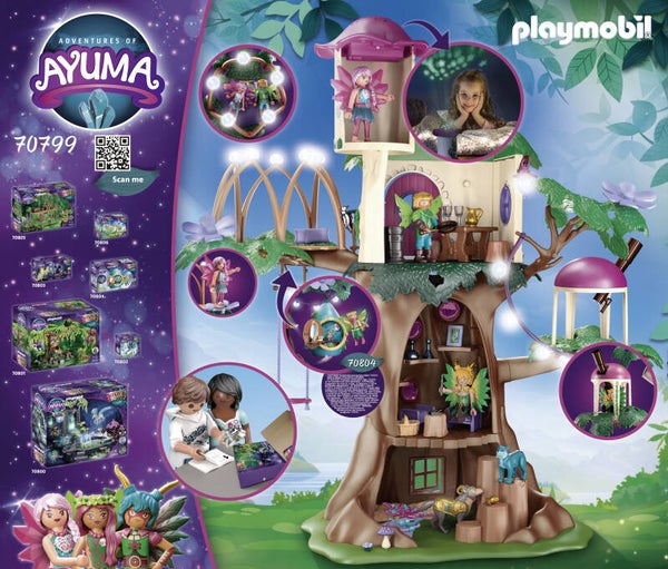 Diep in het betoverde sprookjesbos staat de mysterieuze gemeenschappelijke boom. Het is niet alleen de woonplaats van de feeën, maar ook een veilig toevluchtsoord voor de magische wezens en hun vriendelijke totemdieren. Elke feeënsoort wordt met zijn symbool op de boom afgebeeld. De feeën ontmoeten elkaar in de gezellige gemeenschappelijke ruimte voor vrolijke gesprekken. Om de sterren te observeren, gebruiken ze de telescoop van het observatorium. Je kunt heerlijk wegdromen door het patroon van het paviljoen op het houten platform aan de zijkant met zijn lichtgevende lantaarns en gezellige kussens en dekens. In de toren van de boom staat een sterrenprojector waarmee een romantische sterrenhemel op het plafond geprojecteerd kan worden. De trouwe totemdieren hebben een knusse beschutting onder de boomwortel. Hier is voldoende ruimte om te eten, spelen en rusten .