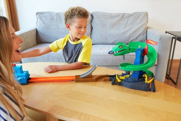 Een mega grote cobra valt Hot Wheels Stad aan en je vrienden kunnen niet ontsnappen! Jij moet de cobra verslaan!