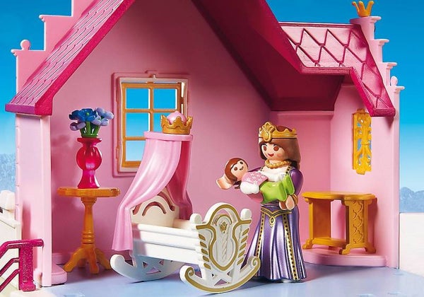 De koning en de koningin wonen in het prachtige PLAYMOBIL Koninklijk Slot. Via de mooie draaitrap bereik je de salon van de koningin waar haar sofa en een spiegel staan. Hier kan komt de koningin helemaal tot zichzelf en kan ze zich mooi maken voor de feesten. Daarnaast bevindt zich de kinderkamer waar de baby heerlijk ligt te slapen in het wiegje. De koning zit vaak op zijn troon op de begane grond.
